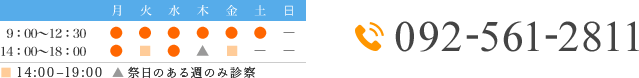 休診日:日曜日・祝日 ■ 14:00–19:00 ▲ 祭日がある週のみ診察